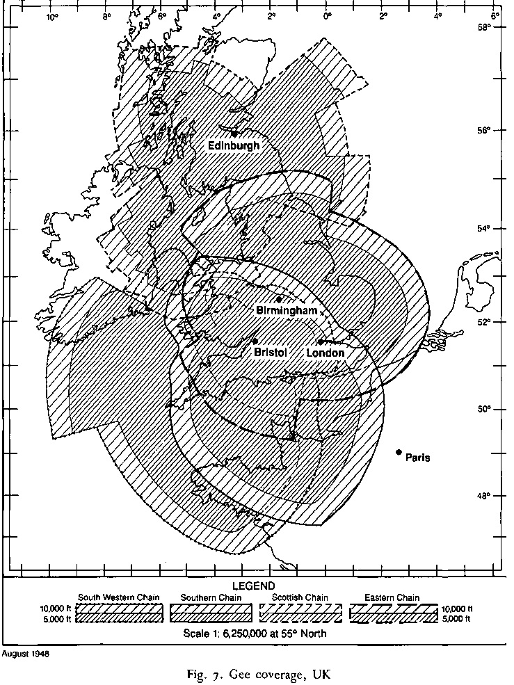 Se establecieron varias cadenas Gee en el Reino Unido y, después de 1944, también en el extranjero. En 1948 había cuatro cadenas en el Reino Unido (ver Figura 7), dos en Francia y una en Alemania. El Gee se convirtió en una de las ayudas a la navegación aérea por radio más extendidas de su época, convirtiéndose en estándar en la Octava Fuerza Aérea de EE.UU., así como en la RAF.
